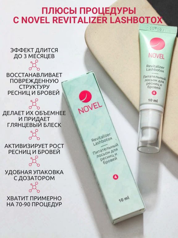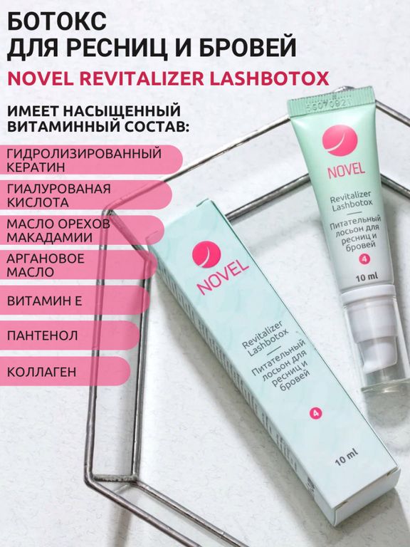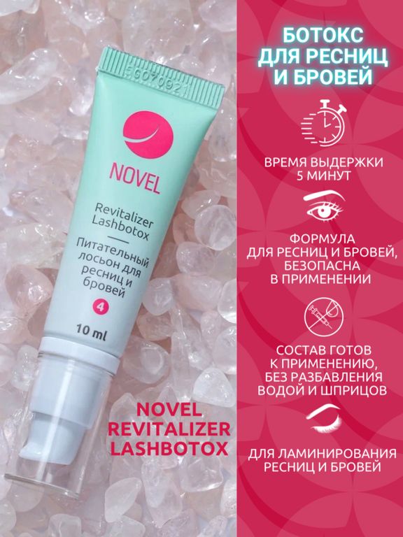 Профессиональное средство для укрепления, стимуляции роста ресниц и бровей, придания им глянцевого блеска. Ботокс Novel Revitalizer Lashbotox усиливает ухаживающий эффект от процедуры ламинирования.