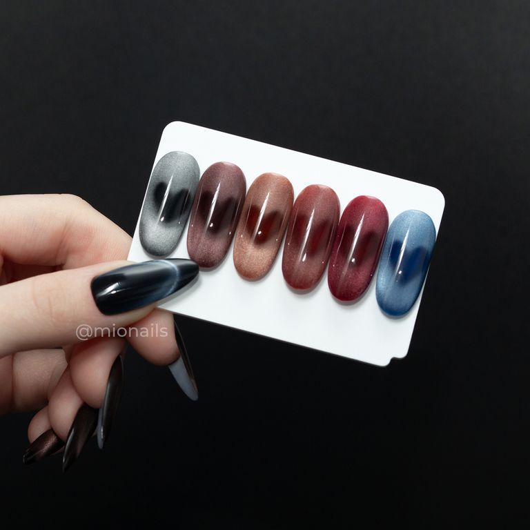 Коллекция «Azia Cats» – 6 темных и насыщенных оттенков магнитных гель-лаков с эффектом «кошачий глаз», которые создают необычное сочетание деликатного блика и темных оттенков.