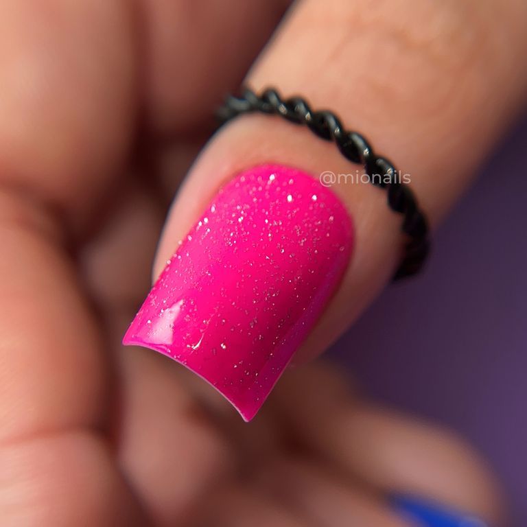 - Имеет кристально глянцевую основу, частички легко утопают в топе, не создавая шероховатость на поверхности ногтя;