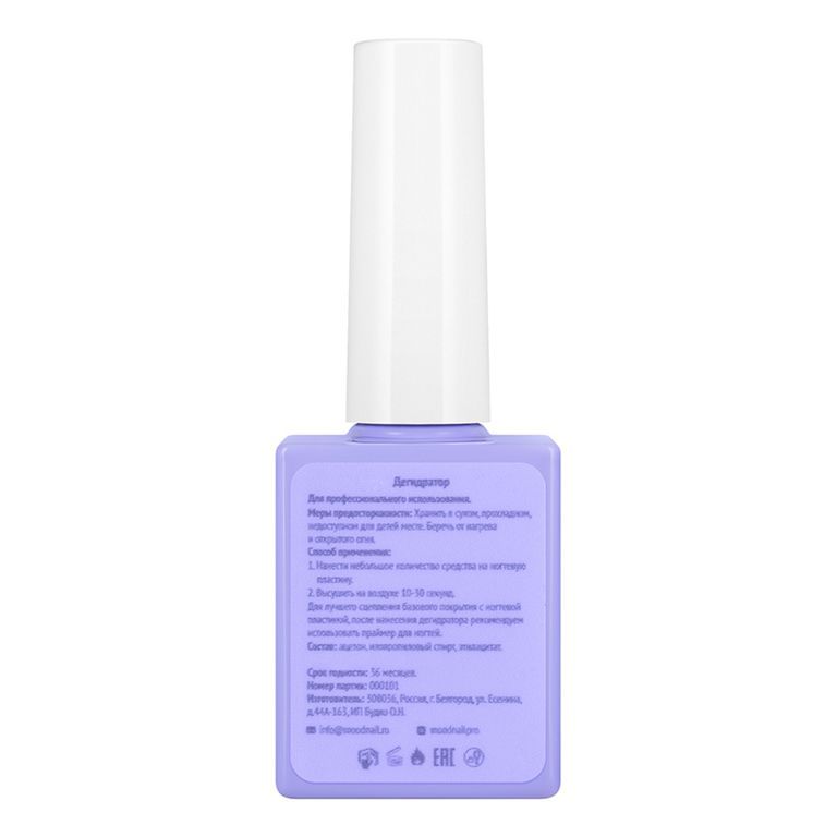Осуществляет процесс дегидрации натуральных ногтей. Удаляет излишнюю влагу и подсушивает на глубоком уровне. Обеспечивает прочную адгезию. Сохнет на воздухе.