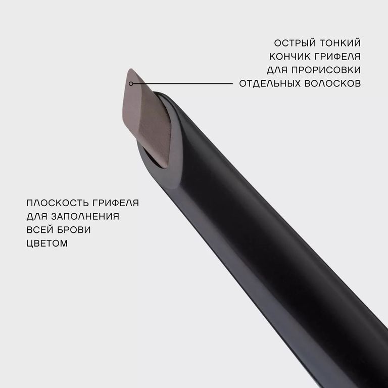 Уникальность карандаша — ультраплоский скошенный стержень в форме двустороннего лезвия, который можно использовать сразу двумя способами. Если тебе нужно прорисовать отдельные волоски и придать бровям естественный вид, воспользуйся острым тонким кончиком грифеля. А если необходимо создать графичные брови и заполнить их цветом, используй плоскость грифеля для натуральной растушевки. Щеточка-расческа на другом конце карандаша поможет равномерно распределить оттенок и придать бровям нужную форму. Формула на основе натуральных восков обеспечивает стойкость текстуры.