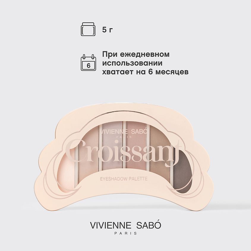 CROISSANT от VIVIENNE SABÓ — палетка теней из шести холодных оттенков с матовым финишем. Почувствуй этот аромат свежеиспеченного круассана, атмосферу прогулки по утренним улочкам Парижа и магию французского шарма.