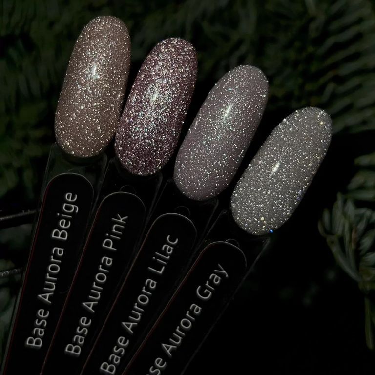 Base Аurora Beige - комфортная в работе база, средней эластичности, средне-густой консистенции, с большим количеством светоотражающих частичек, которые в сочетании с бежевым цветом придают маникюру праздничное настроение.