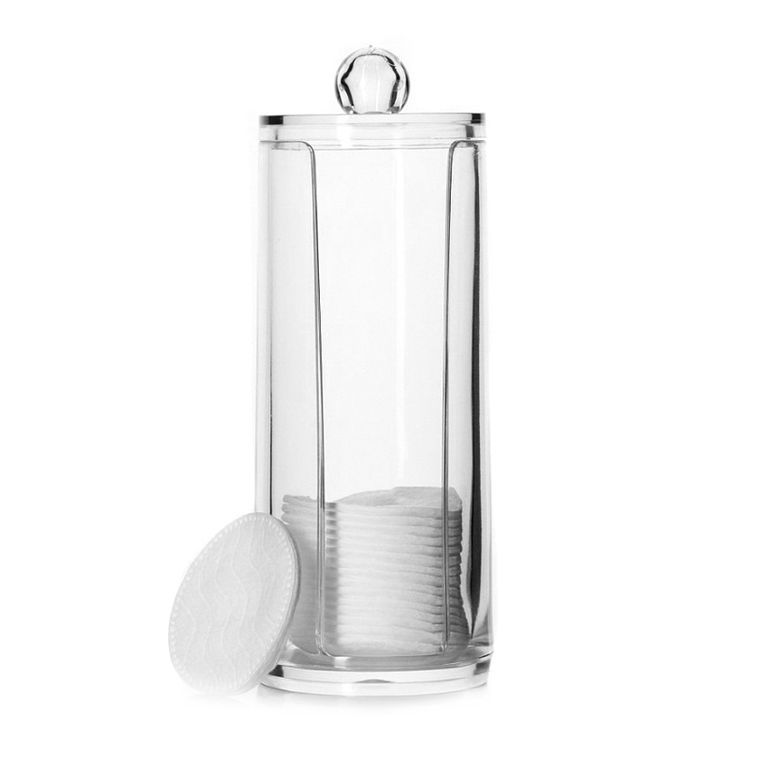 Прозрачный диспенсер для ватных дисков с крышкой от подходит для удобного и гигиеничного хранения одноразовых материалов. В контейнере сделан вертикальный вырез для легкого извлечения ватных дисков.