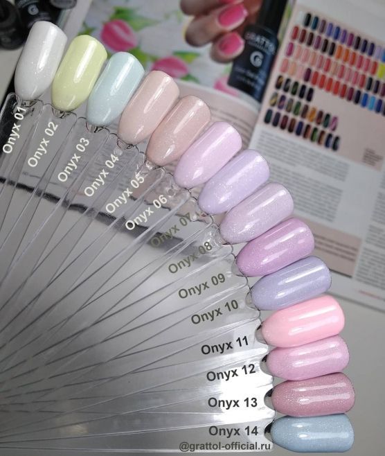 Коллекция Onyx от Grattol – это искрящиеся пастельные оттенки гель-лаков, наполненные нежными сверкающими микроблестками. Кремовая текстура гель-лаков, высокая прочность покрытия и гипоаллергенный состав не оставит равнодушной ни одну девушку. Высокая степень пигментации большинства гель-лаков позволяет наносить их в 1 слой или 2 тонких.