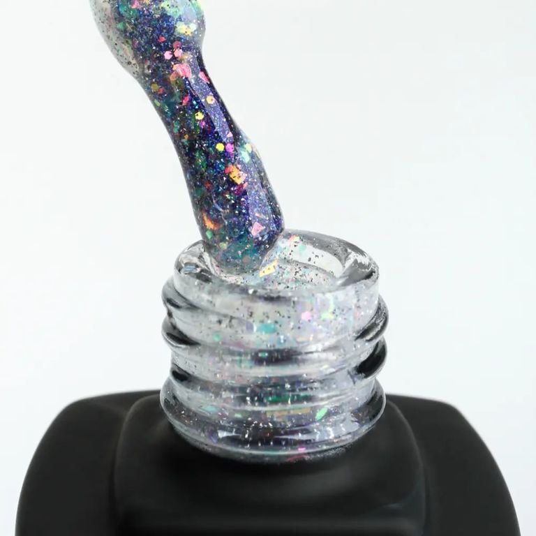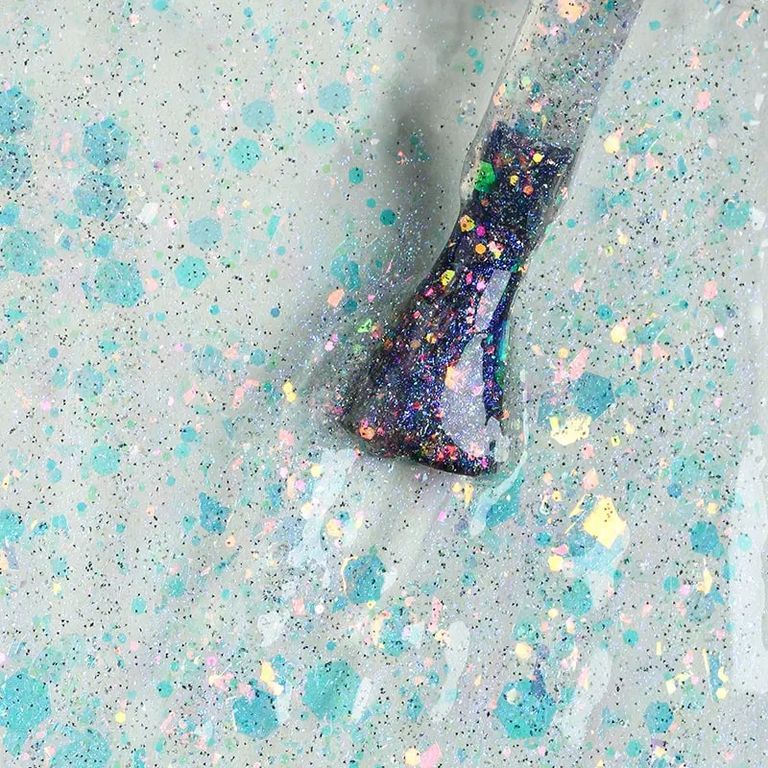 Этот оттенок ждали все! Ослепительный фейерверк сияющего шиммера, голографических шестигранников и «битого стекла» в снежных серебряно-голубых тонах просто создан для нейл-шедевров.