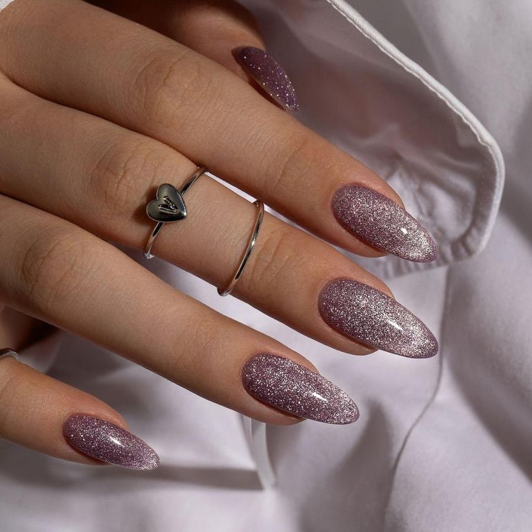 Гель-лак сиреневого оттенка с эффектом "Кошачий глаз" и светоотражающими частицами.