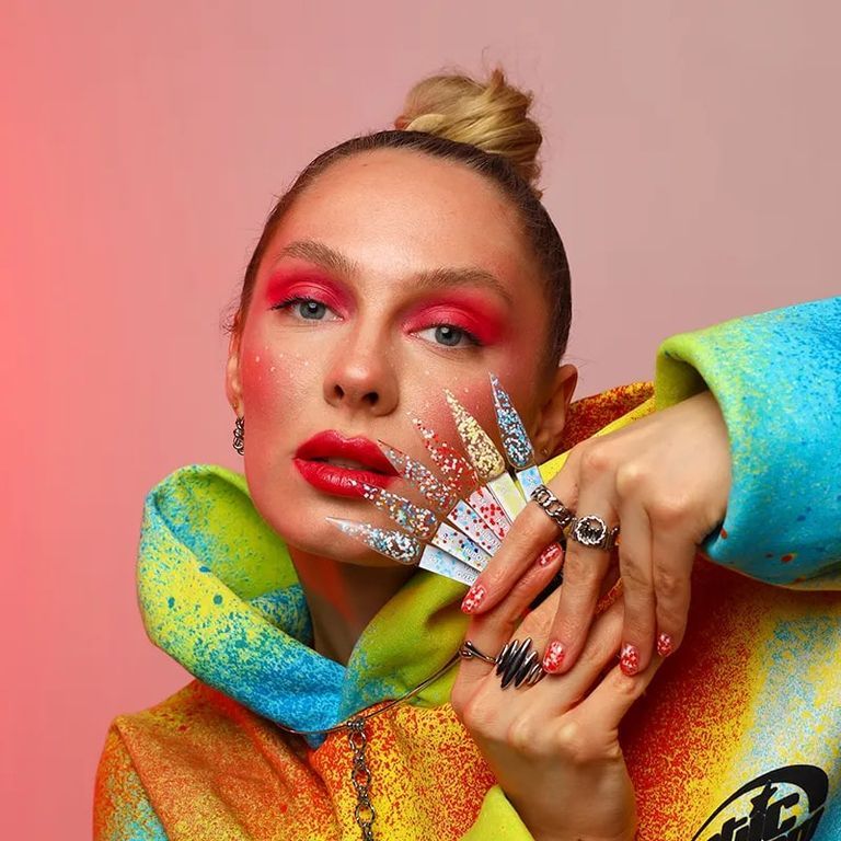 Униформа настоящего художника — любимый джинсовый комбинезон с брызгами краски и маникюр с миксом ярко-бирюзового и безупречно белого матового глиттера. Примеришь?