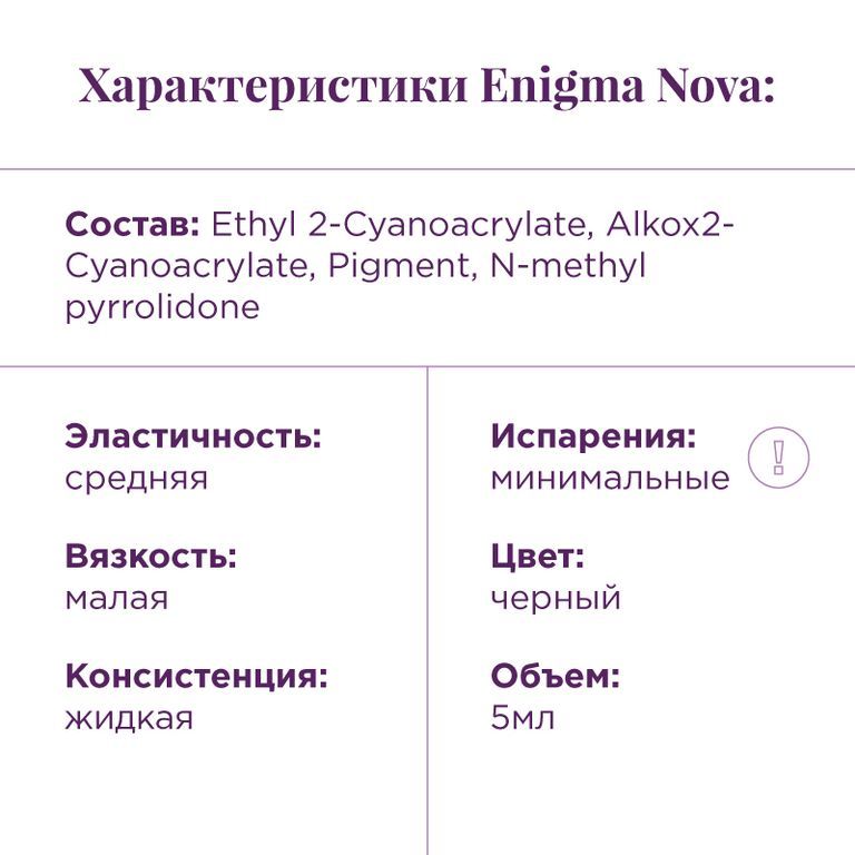 Средняя эластичность и жидкая консистенция удобны в работе, клей не растекается, расходуется экономно. В составе более безопасный цианоакрилат, что позволило снизить испарения. ENIGMA NOVA надежный и стойкий клей обеспечивает носку ресниц до 8 недель.