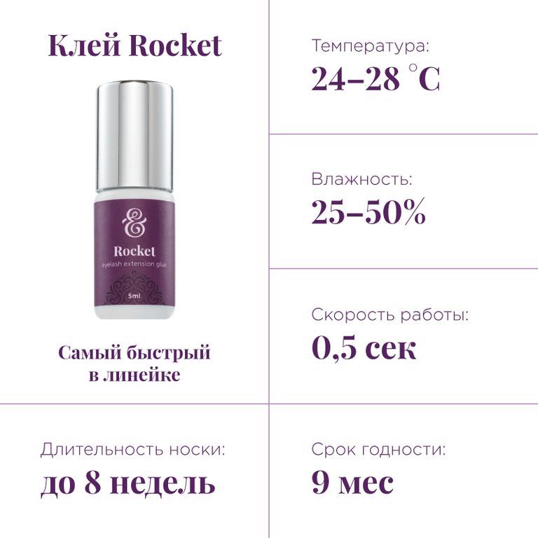 Средняя эластичность и средне-жидкая консистенция удобны в работе, клей не растекается, расходуется экономно. Благодаря Этоксицианоакрилату в составе испарения снижены, поэтому он отлично подойдет для мастеров чувствительных к испарениям. ENIGMA ROCKET надежный и стойкий клей обеспечивает носку ресниц до 8 недель.