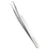 Инструмент маневренный, быстрый, комфортный: у него удобный угол, а небольшой кончик позволяет добраться до уголков глаз клиента. Удобно, что такая форма пинцета не требует изменения опоры руки. Ещё одно преимущество — он подходит для всех способов формирования пучка. Также пинцет Мини L-45 отлично проявляет себя в работе с L-образными изгибами.