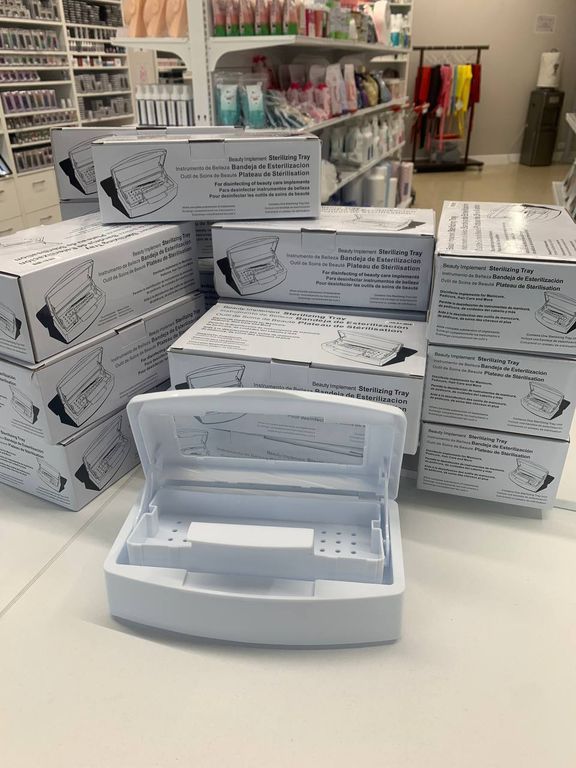 Это емкость для дезинфицирующего средства, внутри имеет вынимающийся перфорированный поддон с дырочками, который Вы можете вынимать и промывать в нем инструменты проточной водой. Снаружи крышка, которая при закрытии погружает поддон с инструментами на дно.