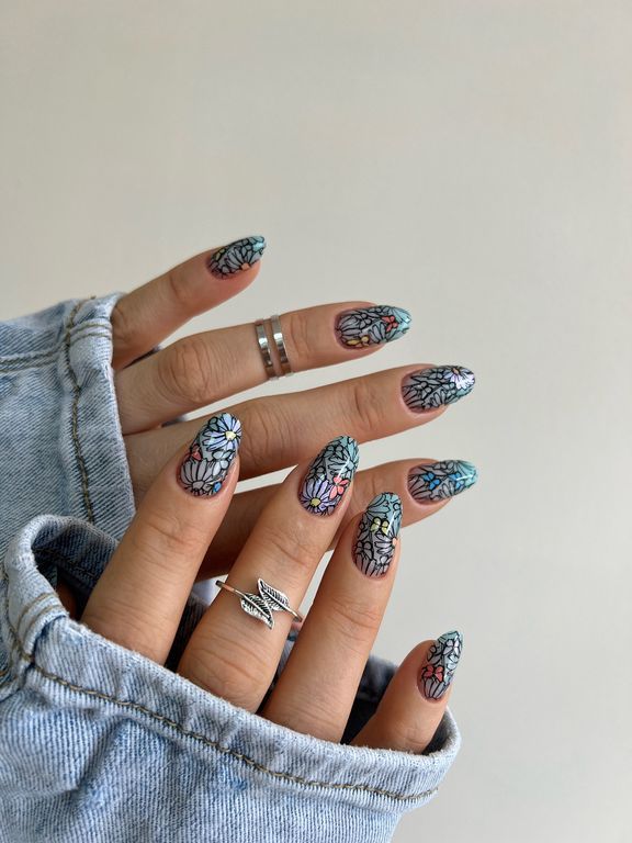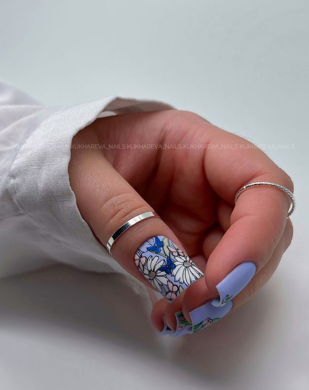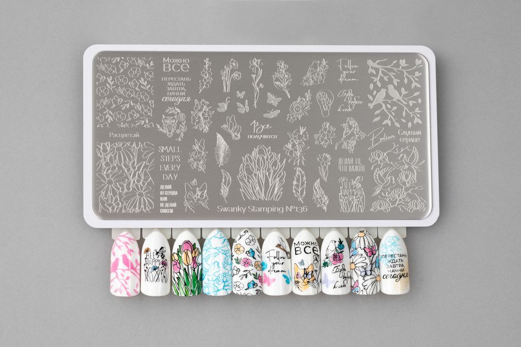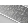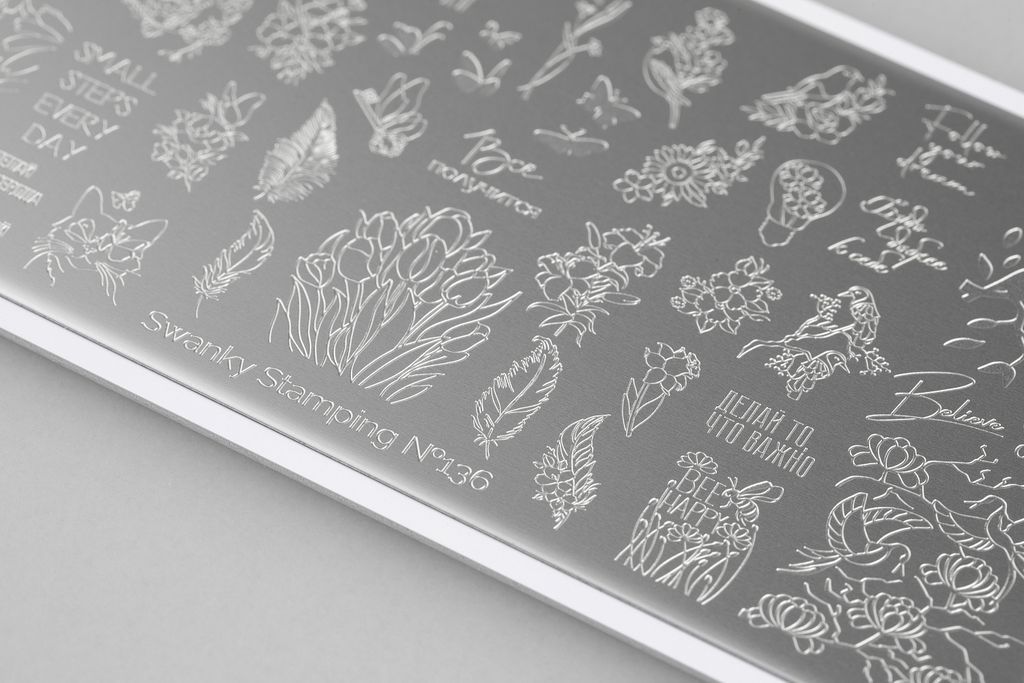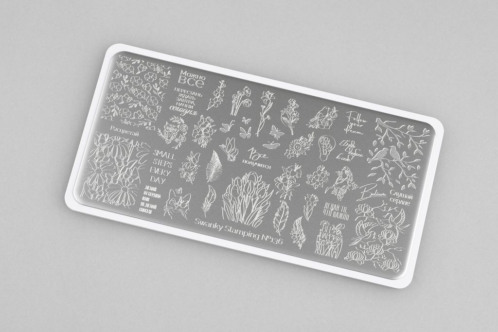 Нежная пластина весенне-летнего сезона, наполненная, как одиночными рисунками, так и паттернами цветов, птиц и надписей, имеющий тонкий, мечтающий характер. Дизайн прекрасно подойдет для техники реверсивного стемпинга. Все элементы можно разукрасить в любой цвет и украсить маникюр утонченной, романтичной натуры.