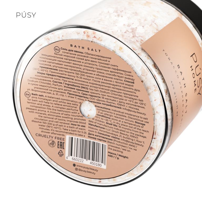 Ароматизированная соль для ванн бренда PÚSY — это настоящая расслабляющая спа - процедура, не выходя из дома. В состав этого beauty - средства вошли: крупная белая морская соль, которая снимает напряжение, улучшает отток лимфы, снимает отеки и насыщает кожу множеством микро - и макроэлементов и гималайская розовая соль, которая оказывает общеукрепляющее действие на все системы организма, а также смягчает кожу и улучшает работу сосудов