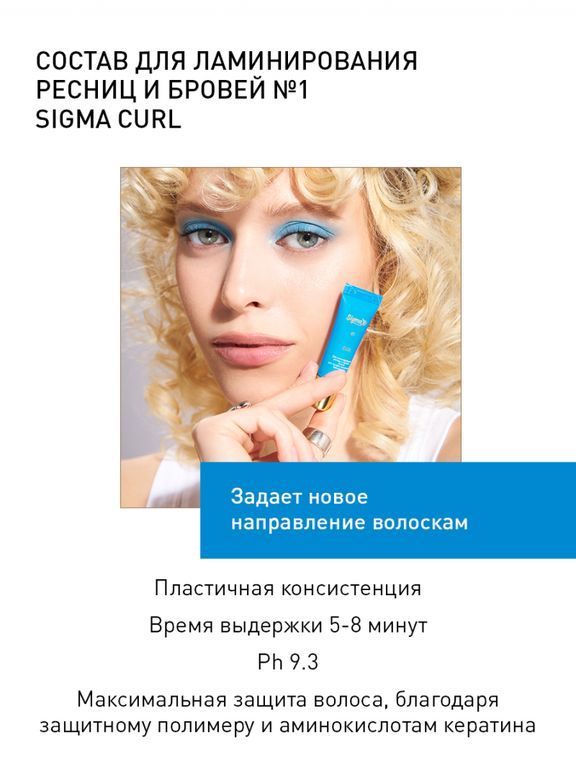 - 2. Препарат Sigma Curl имеет мягкий ph 9.3. С ним вы сможете работать на любых типах ресниц без повреждения и сухости. С гарантированным получением упругого завитка.